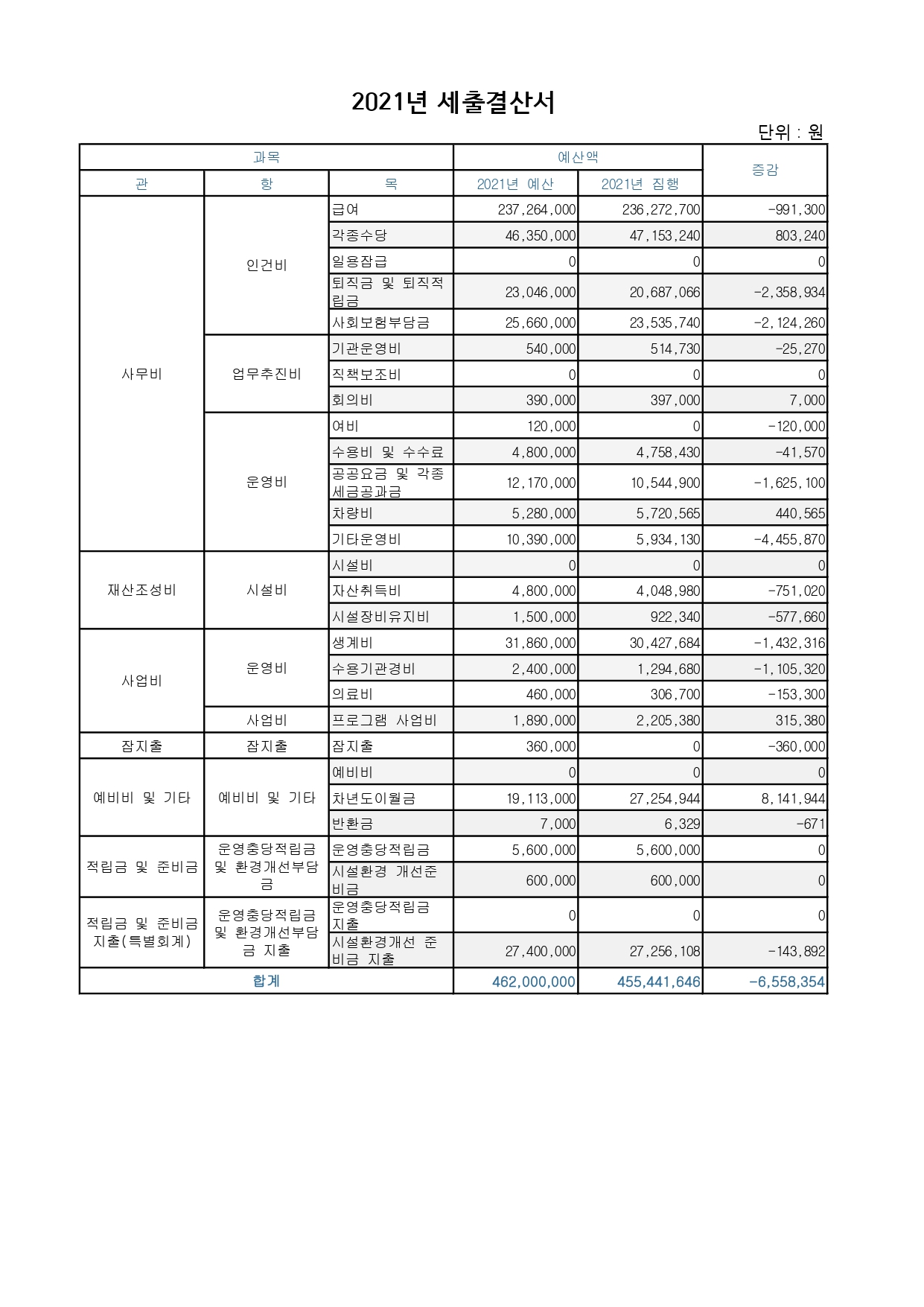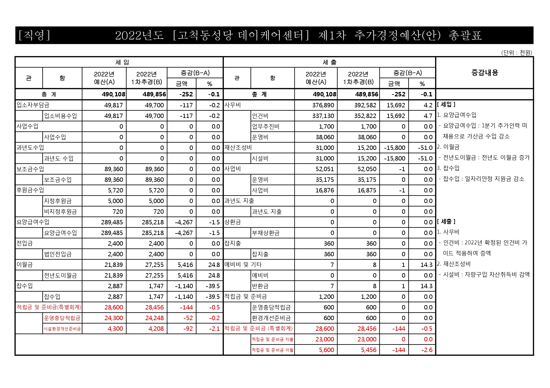 사회복지법인 재무회계규칙 제19조, 제41조의 6의 규정에 따라 2021년 결산 및 2022년 제1차 추가경정 예산을 아래와 같이 공고합니다.