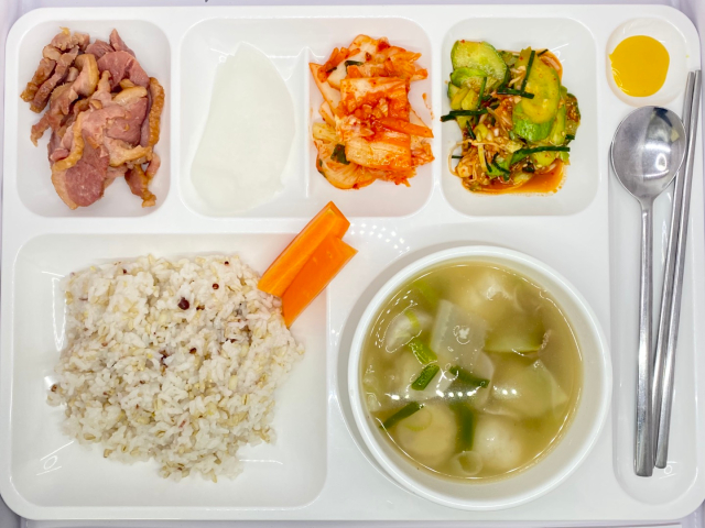 4/10 잡곡밥, 소고기토란국, 훈제오리&머스타드, 오이달래무침, 쌈무, 배추김치, 당근