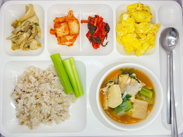 8/28 잡곡밥, 동태탕, 토마토계란스크램블, 새송이볶음, 무말랭이무침, 배추김치, 셀러리